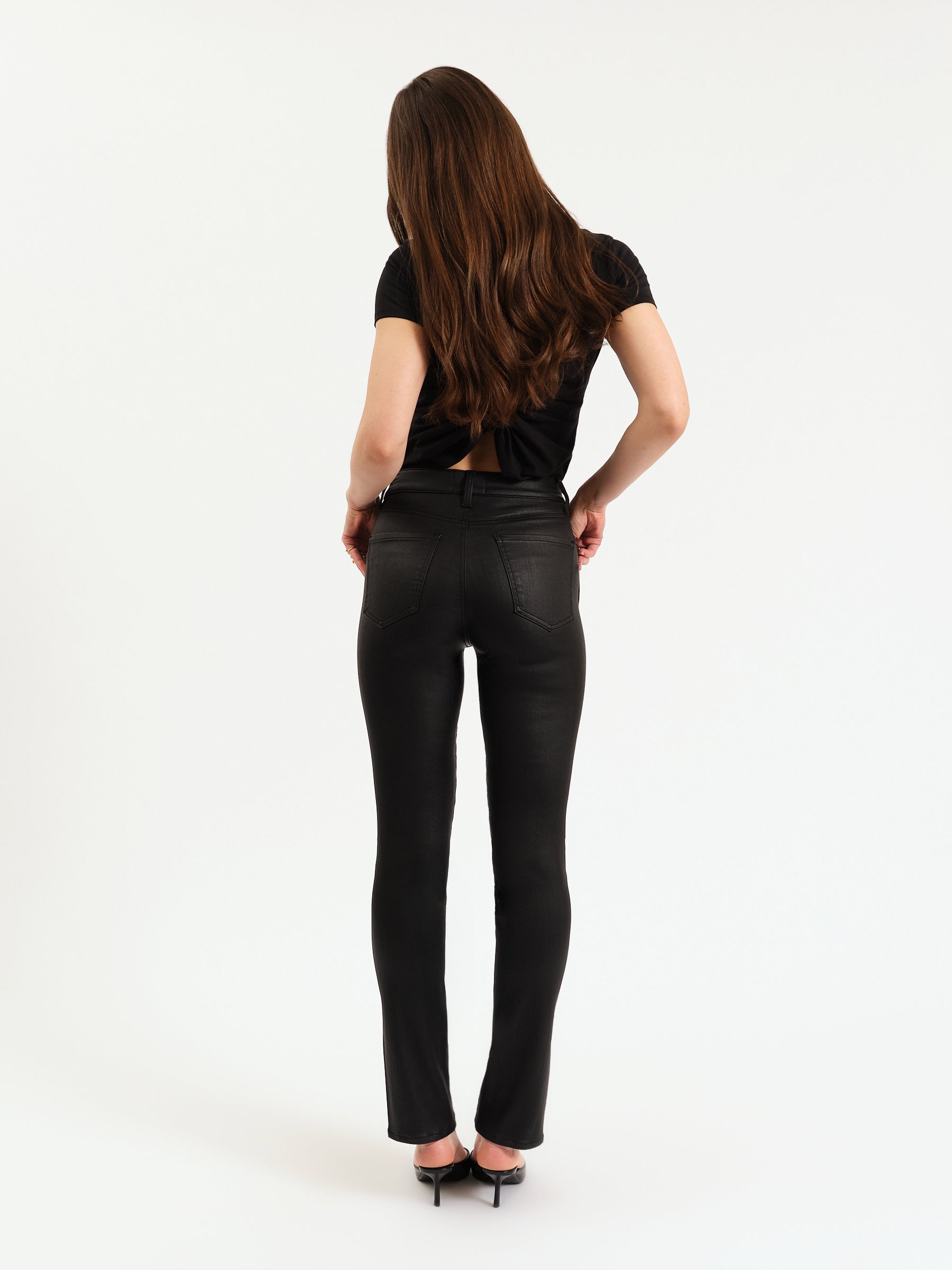 The Downtown in Black Coated is a high rise slim jean in a black coated denim. Finished with flirty ankle slits, this pair is made to show off any statement shoe.
