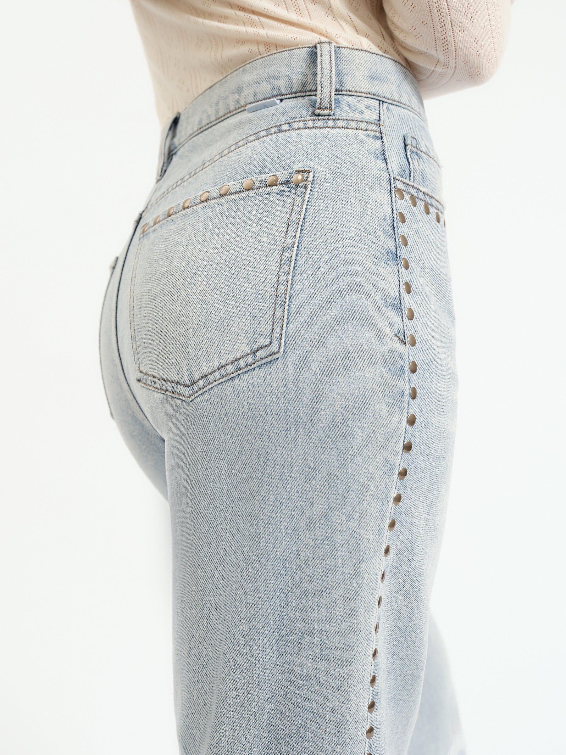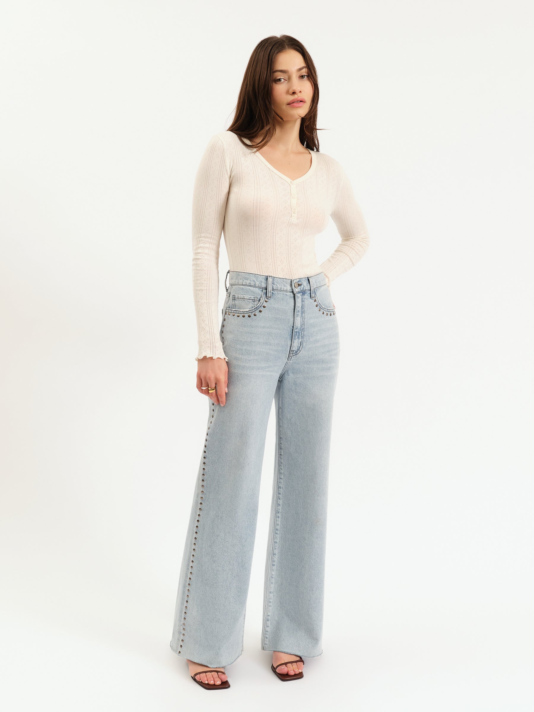 The Far Out in Let's Dance is a high-rise wide leg in a classic light blue wash, featuring studs along the side seams for a touch of cool. Keep it 100 - this jean is constructed from 100% cotton.