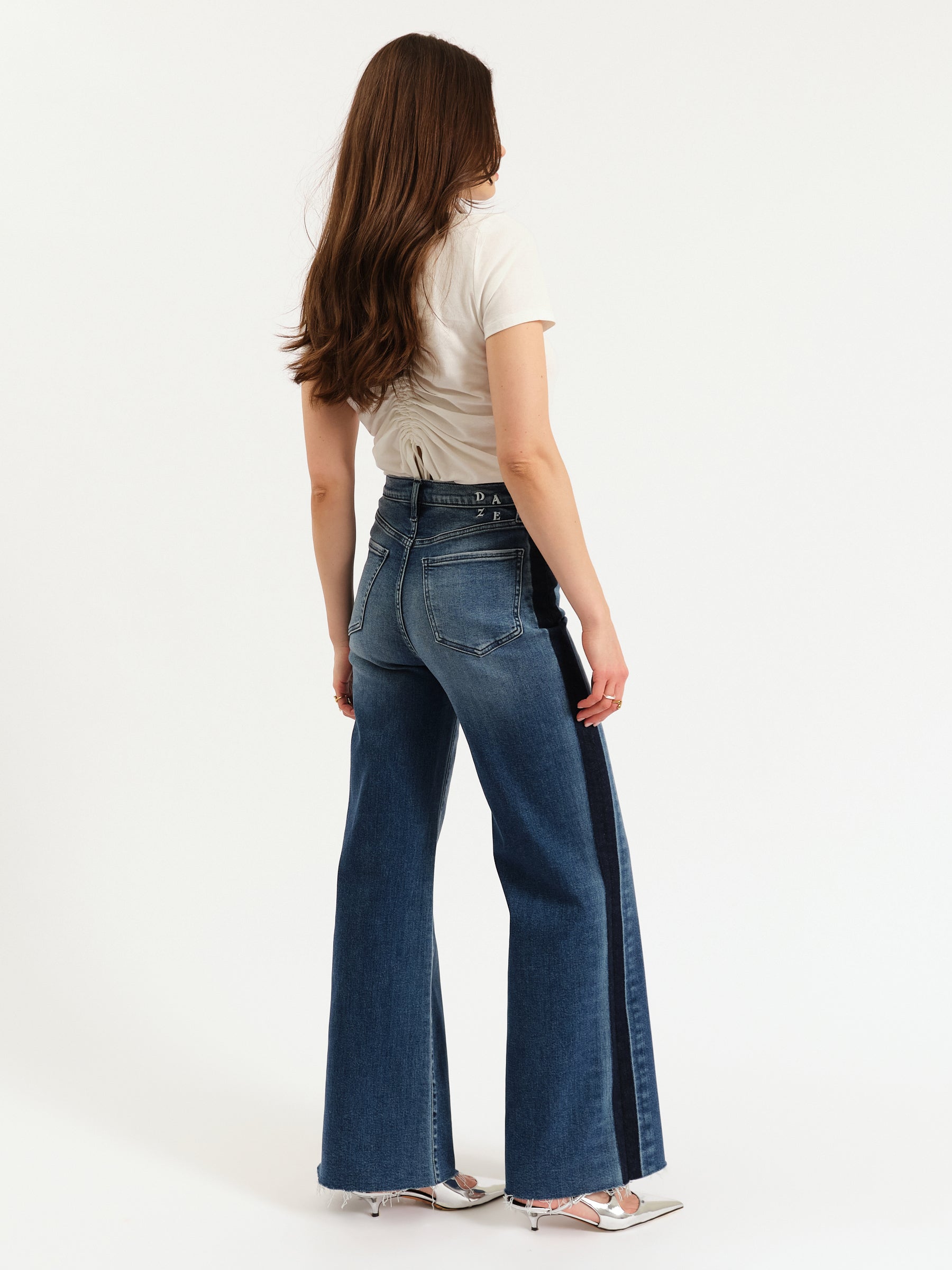 The cool girl jean just got even cooler, Far Out is a modern silhouette with black Tuxedo stripes across the sides of the legs for our take on denim tailored details. In a waist defining high rise, this wide leg is constructed in our "hug" denim that hugs your body, but has just enough weight to keep a structured fit.Â