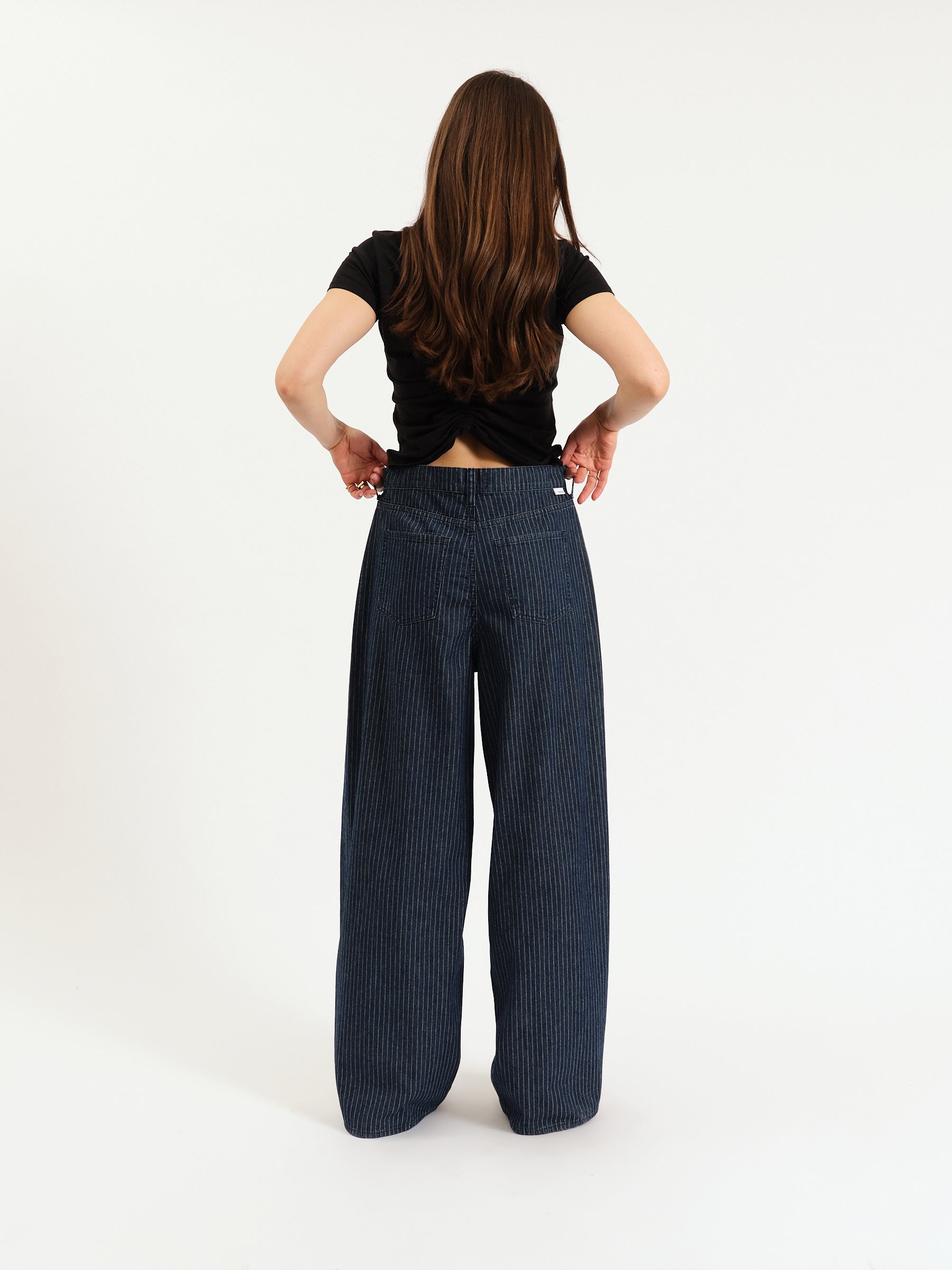 The Highland Baggy fit is an adjustable extreme baggy with detailed pinstripes against a dark wash. Wear this style buttoned up for a cinched waist fit, or wear unbuttoned for a laid-back lower rise look. Keep it 100 - this rigid jean is constructed from 100% cotton.