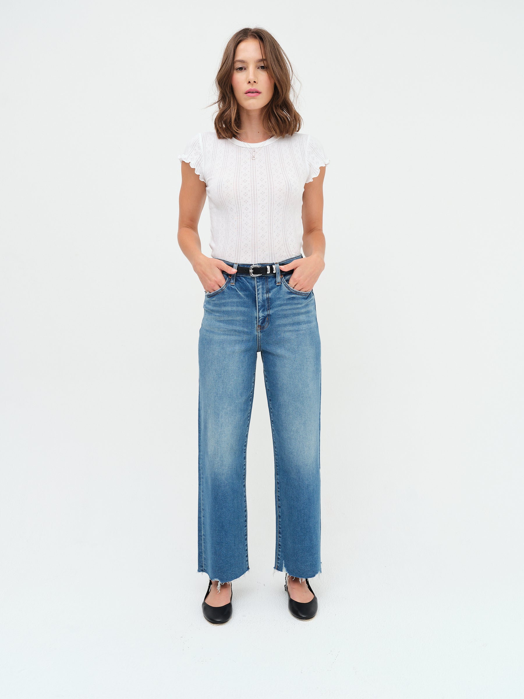 The Pleaser is our tried and true high rise wide ankle, featuring seaming details at the waist against an indigo blue wash with slight fading. This fit is constructed from our Hug denim, which is flexible enough to hug your body, yet heavy enough to cinch you in.