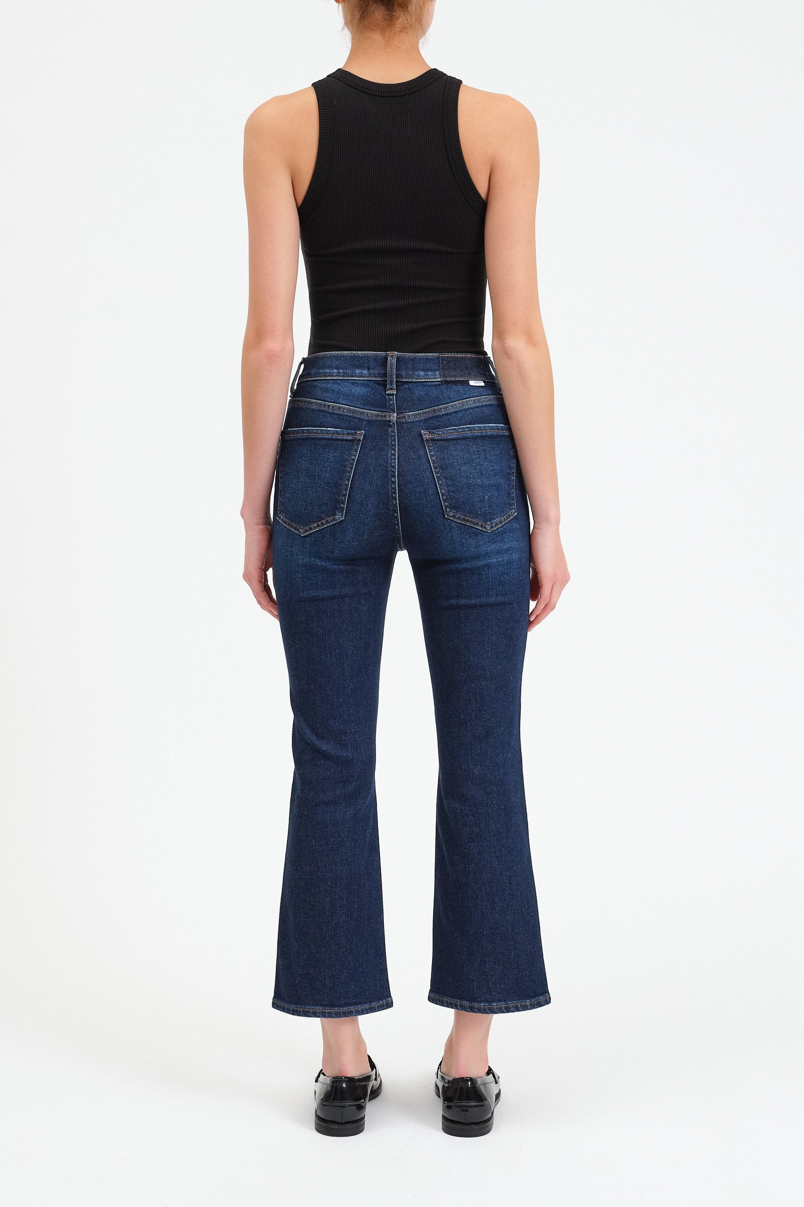 The Shy Girl is a playful high rise crop flare. This timeless dark wash jean features clean hems and whiskering across the front. Created from our Hug denim, this pair has a stretch that fits in all of the right places.