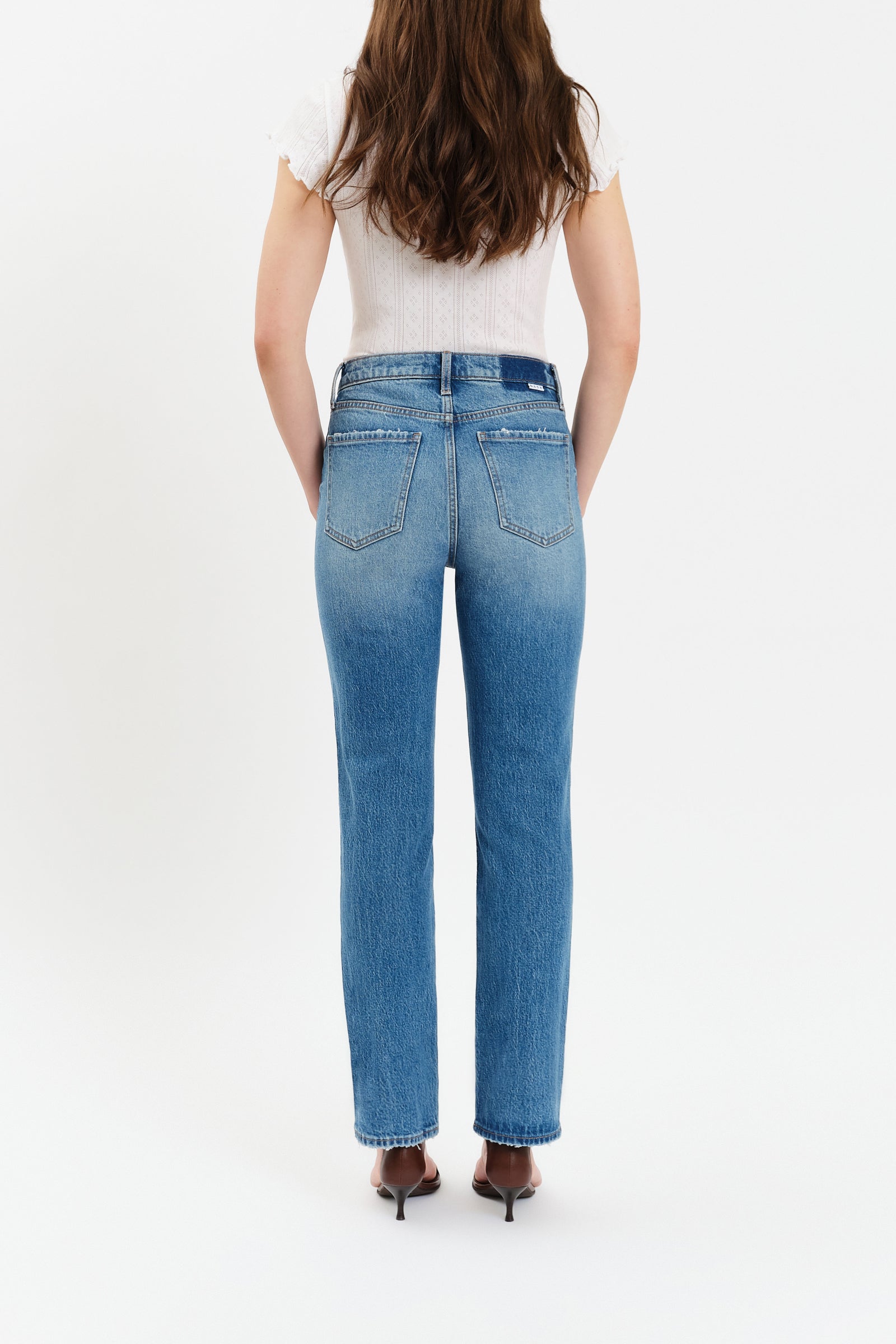 The Smarty Pants in Vintage Ink is a high rise slim straight in a deep blue wash. Its close fit, clean hems, and sophisticated wash make it the perfect polished pair for your day-to-day. Constructed from our Tough Love fabric, this pair is mostly rigid but yields to your body in all the right ways.