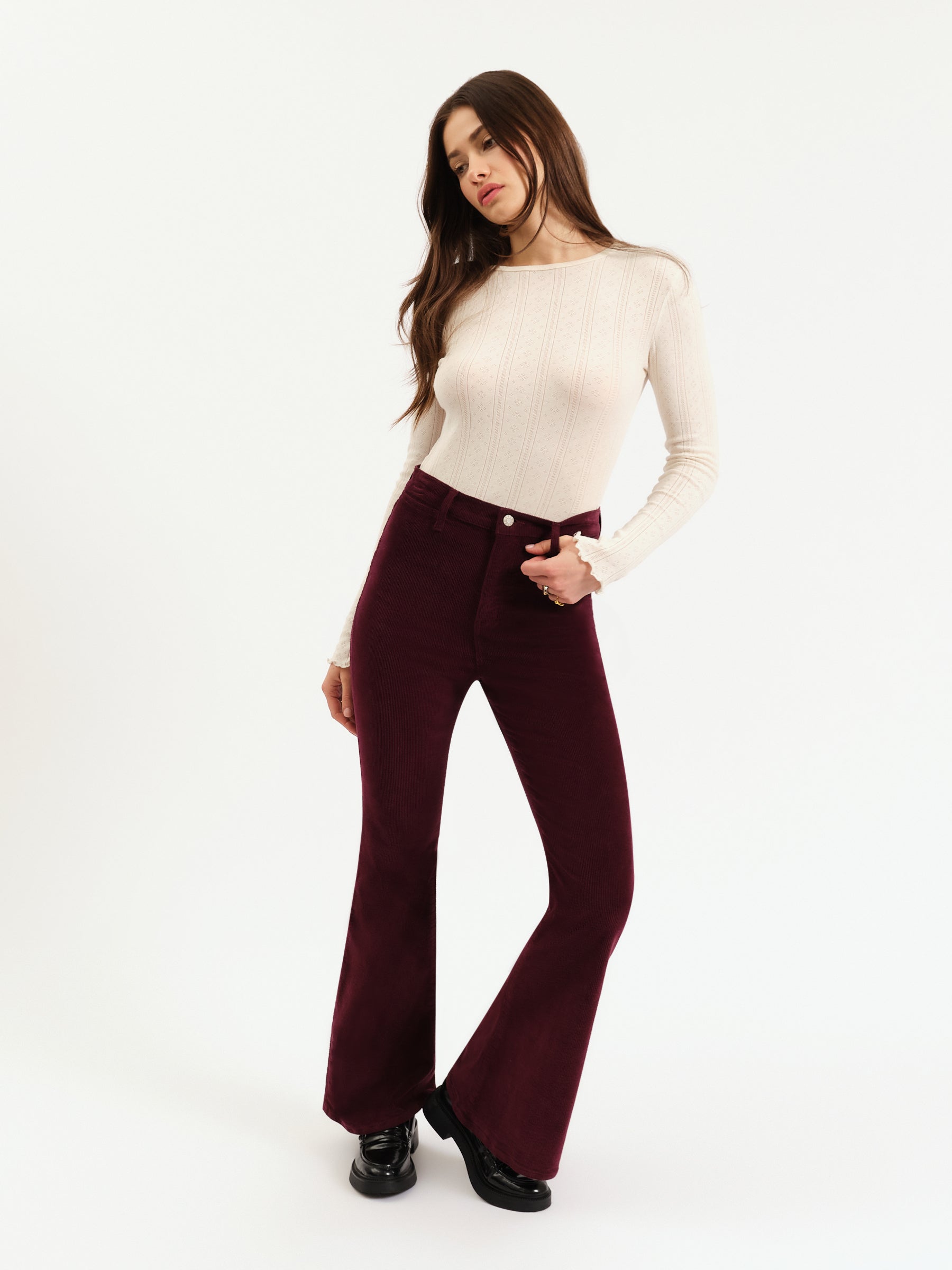 The Sunset Flare in Fig Cord is a high rise flared pant crafted from a rich maroon corduroy. This flattering fit hugs you at the waist and flares dramatically from knee to ankle.