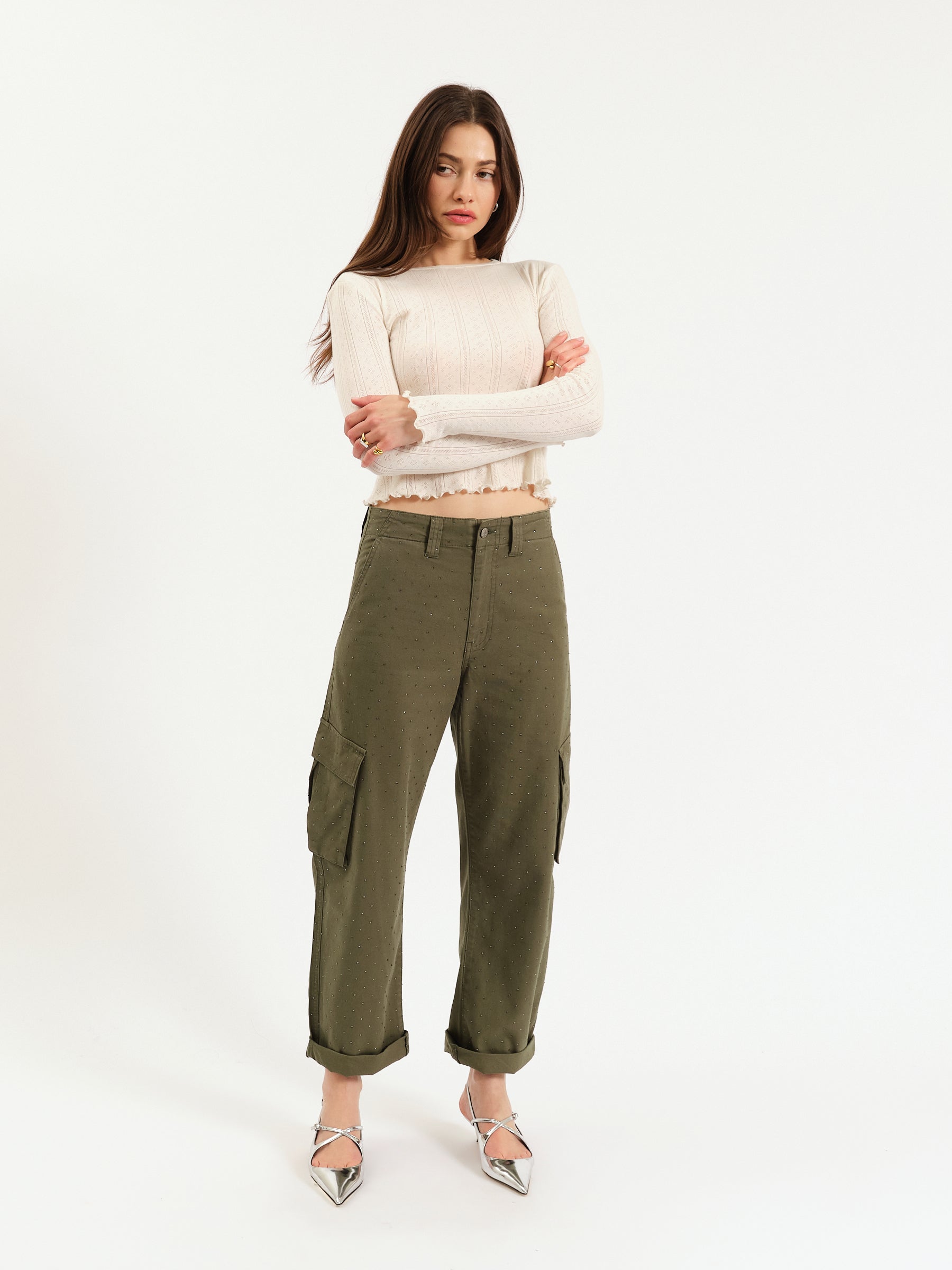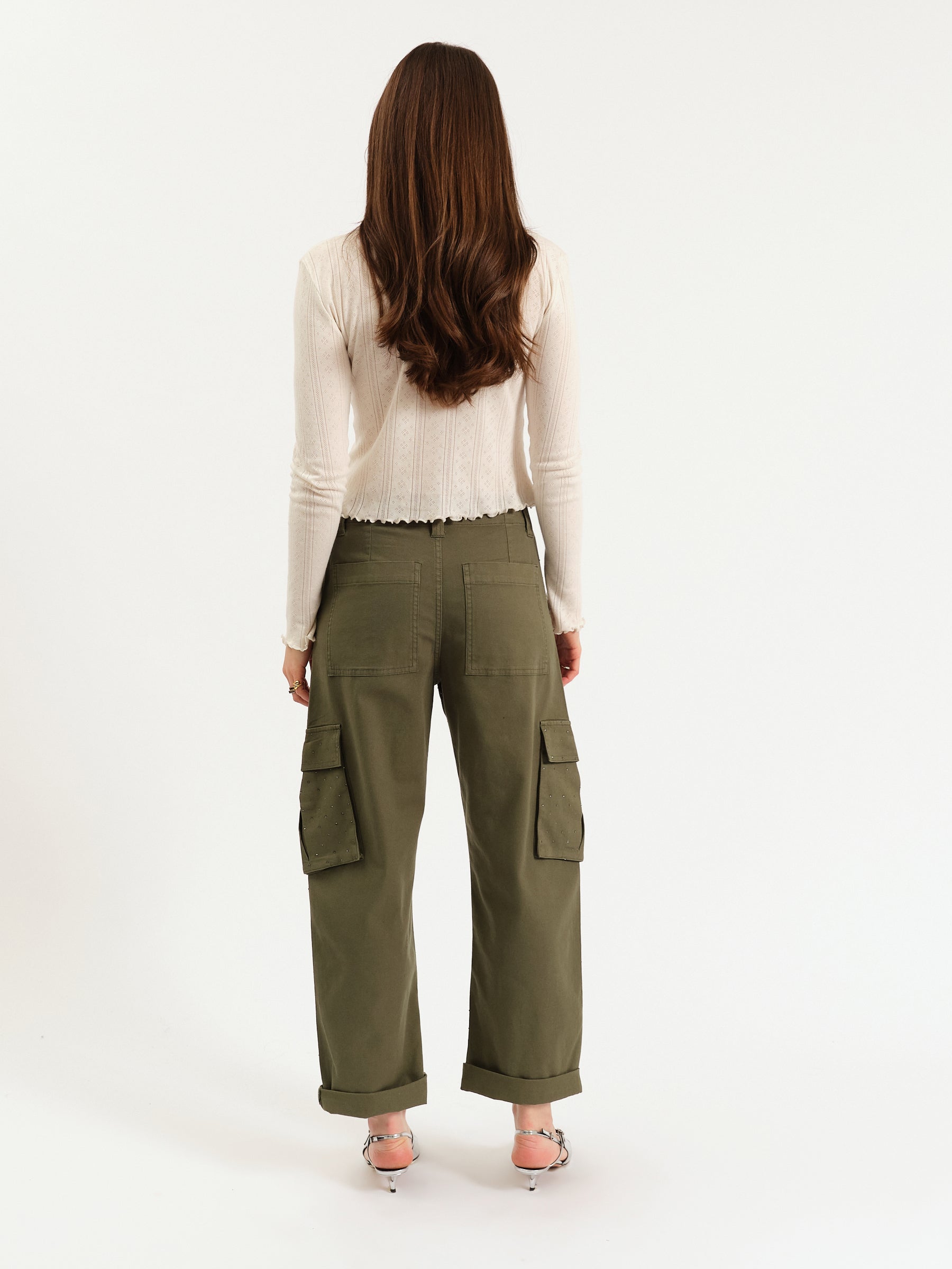 Utility made feminine with the Squad - a curved leg cargo pant featuring bronze studs throughout, and featuring a stretch canvas construction.