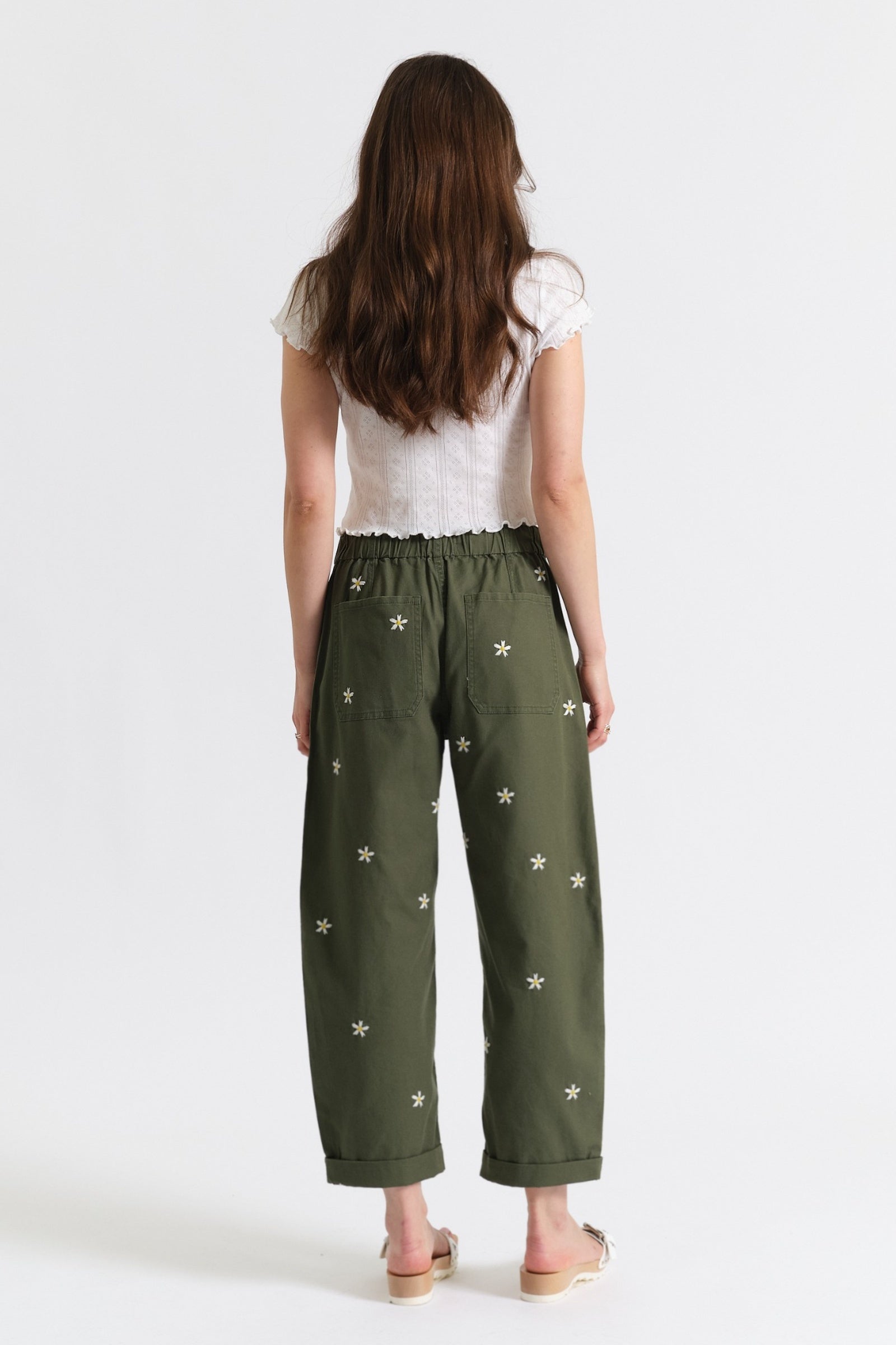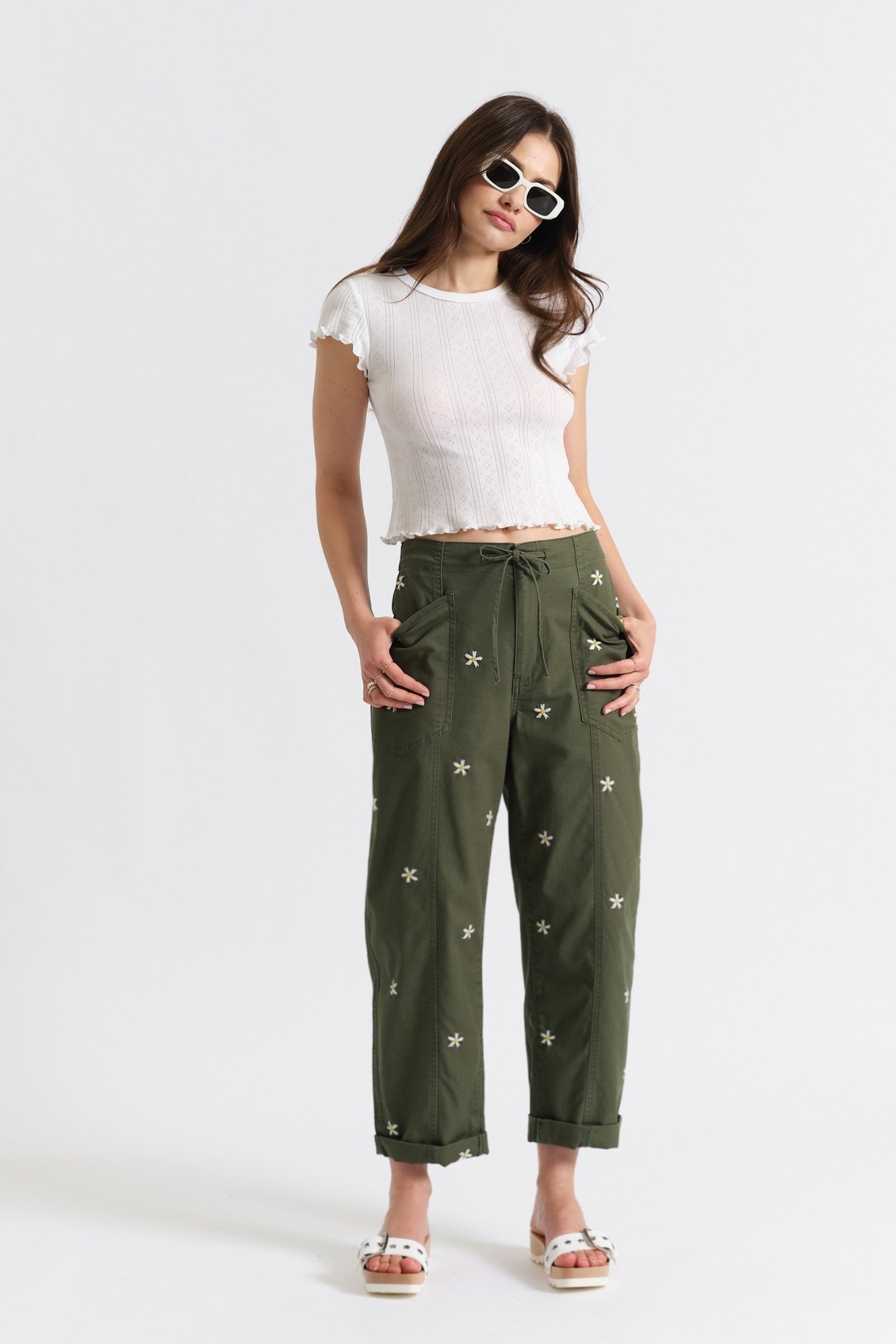 Villa Drawstring Barrel Leg Pant in Bronze Green Daisy