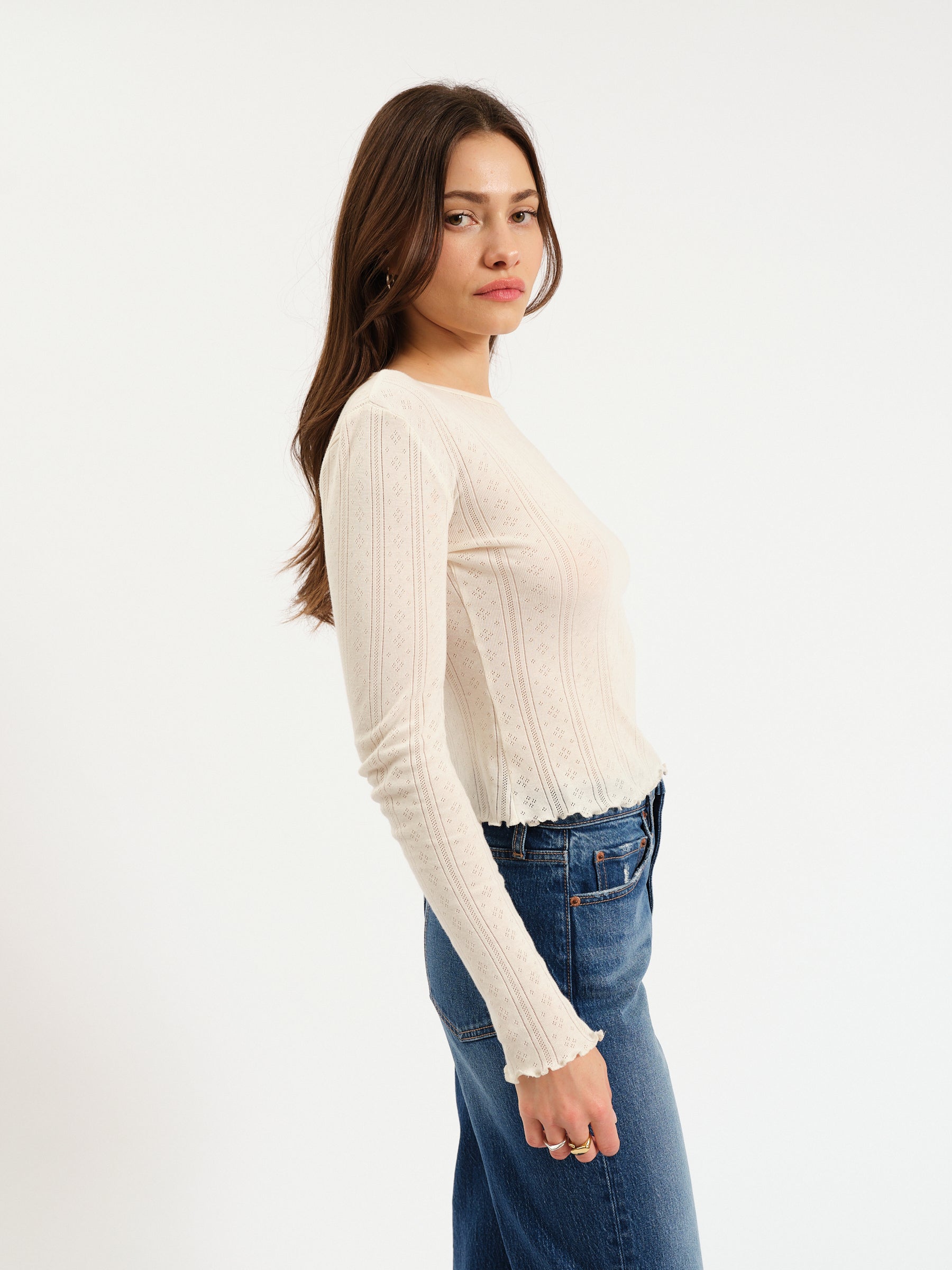 The Waverly in Cloud Dancer is a crewneck made of intricate, pointelle fabric and features vintage-inspired lettuce hems.
