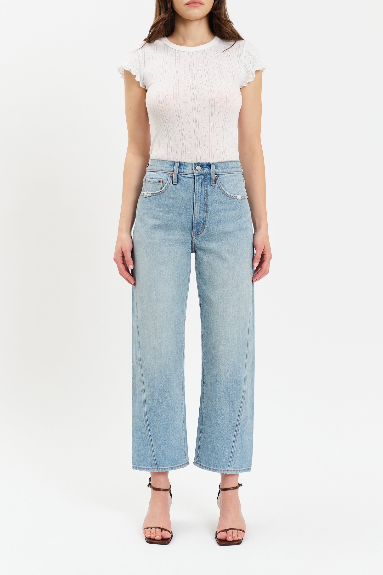 The Westward in Pulse is a high rise jean with a barrel leg silhouette, featuring a cinched waist, bowed leg, and slightly tapered ankle against a vintage-inspired light wash. Constructed from our Tough Love denim, it’s mostly rigid while yielding to your body in all the right ways.